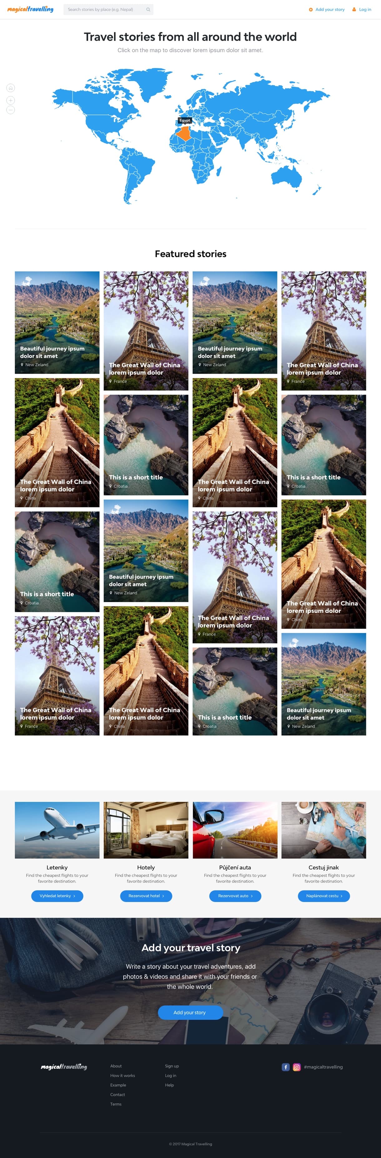 Na záčátku byl pouze klientův nápad, vytvořit přehledný cestovatelský portál, kde si cestovatelé z celého světa mohou vytvářet své vlastní deníky pro inspiraci ostatním. Podle úvodní analýzy jsme vypracovali wireframy a podle nich jsme připravili několik variant designu, následně jsme s klientem vybrali ten pravý. Následovala tvorba HTML šablon. Aplikaci jsme připravili pomoci Symfony frameworku a administrace Sonata. Poradili jsme si taky se složitějším přidávání fotografii do článků, což je jádro celého projektu. Práci s fotkami jsme zajistili asynchronně javascriptem.